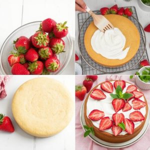 - Montering: Legg det første laget av kakebunnen på et serveringsfat. Smør et lag jordbærsyltetøy og legg deretter et lag med pisket krem. Fordel skivede jordbær over kremen. Legg det andre laget av kakebunnen oppå og gjenta prosessen. Dekk hele kaken med et lag krem og pynt med friske jordbær.