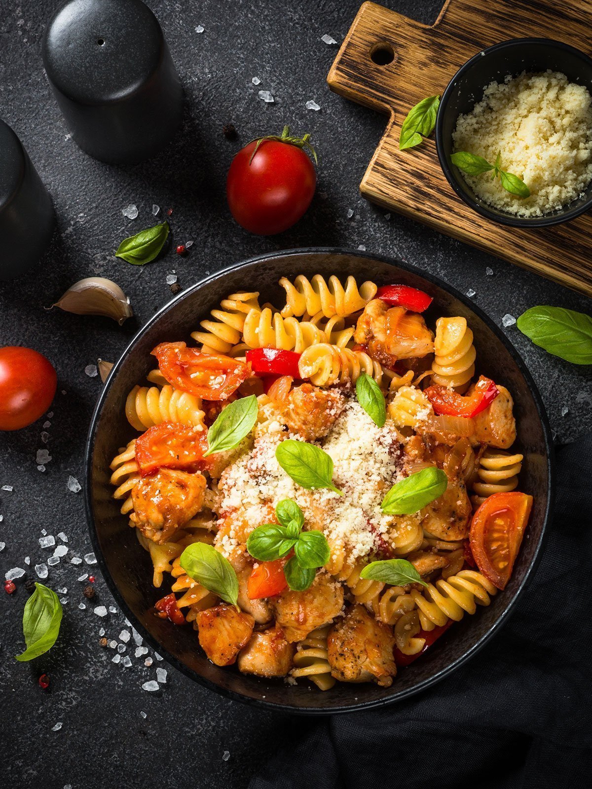 Server kyllingpastaen i tomatsaus varm, toppet med fersk basilikum og revet parmesan.