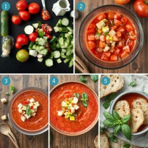 Gazpacho er en klassisk kald suppe fra Andalucía i Sør-Spania. Denne retten stammer fra en tid da varme, tørre somre krevde forfriskende og nærende mat laget av enkle ingredienser. Tradisjonelt ble gazpacho laget med brød, olivenolje, eddik og ferske grønnsaker som tomater, agurk og paprika. I dag er den kjent over hele verden som en avkjølende rett, perfekt for varme dager.