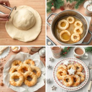 - Varm smult eller frityrolje i en stor gryte til ca. 170–180 °C. Test med en liten deigbit – den skal bli gyllen på ca. 1 minutt.