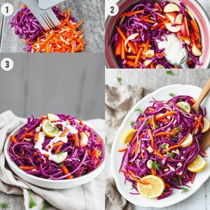 Denne slawen er alt jeg elsker i en sommersalat – sprø, kremet, litt søt, litt syrlig og med akkurat passe sting. Rødkålen gir et solid krønsj som holder seg lenge, selv etter blanding med dressing. Gulroten gjør salaten saftig og mild, mens eplet gir en naturlig sødme og fruktighet. Dressingen er fløyelsmyk med yoghurt i bunnen, balansert med frisk sitron og et hint av skarp sennep. Når jeg tar en bit, kjenner jeg umiddelbart den perfekte balansen mellom det friske og det kremede, og fargene gjør meg alltid glad.
