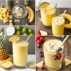 Etter hvert som smoothies ble populære over hele verden, utviklet de seg fra enkle fruktblandinger til næringsrike måltider. Denne ananas-smoothien kombinerer sødme, syrlighet og kremet konsistens på en perfekt måte. Yoghurt gir en silkemyk fylde, mens havregryn gjør den mer mettende. En skvett limejuice balanserer smaken, og litt ingefær tilfører en spennende, lett krydret varme.