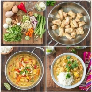 Denne gryten byr på en harmoni av smaker som både er rike og balanserte. Kokosmelken gir sausen en silkemyk tekstur som omslutter tungen, mens currypasten tilfører en subtil varme uten å være overveldende. Grønnsakene beholder en herlig sprøhet, og den syrlige friskheten fra lime løfter smaken enda et hakk. Kyllingen er mør og saftig, og sammen med den nøtteaktige crunch fra cashewnøtter blir hver bit en fullkommen opplevelse. Det beste? Den duften som fyller kjøkkenet mens gryten småputrer – krydret, søt og uimotståelig.
