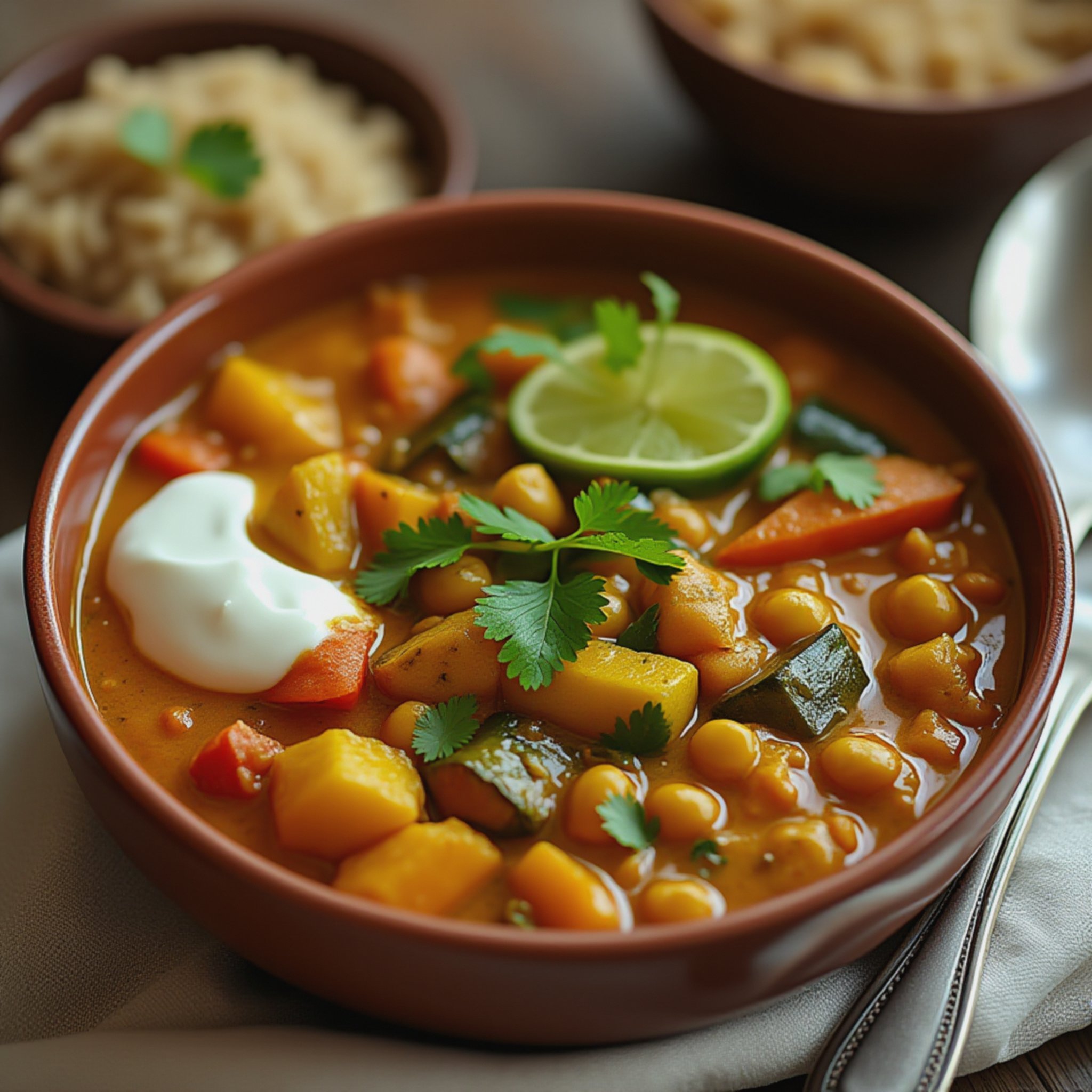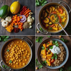Jeg oppdaget currygryter da jeg begynte å eksperimentere mer med vegetarisk mat. Det startet med en inspirasjon fra en matblogg, men jeg tilpasset den raskt med grønnsaker jeg ofte har hjemme – squash og gulrot. Kokosmelken gir den silkemyke sausen, og krydderne vekker liv i hele retten. Den ble en slager hjemme hos oss fordi den både metter og varmer uten å tynge. Jeg liker hvordan smaken tar meg med på en liten reise til India, samtidig som den føles trygg og hverdagslig nok til å bli en fast rett i vår ukemeny.