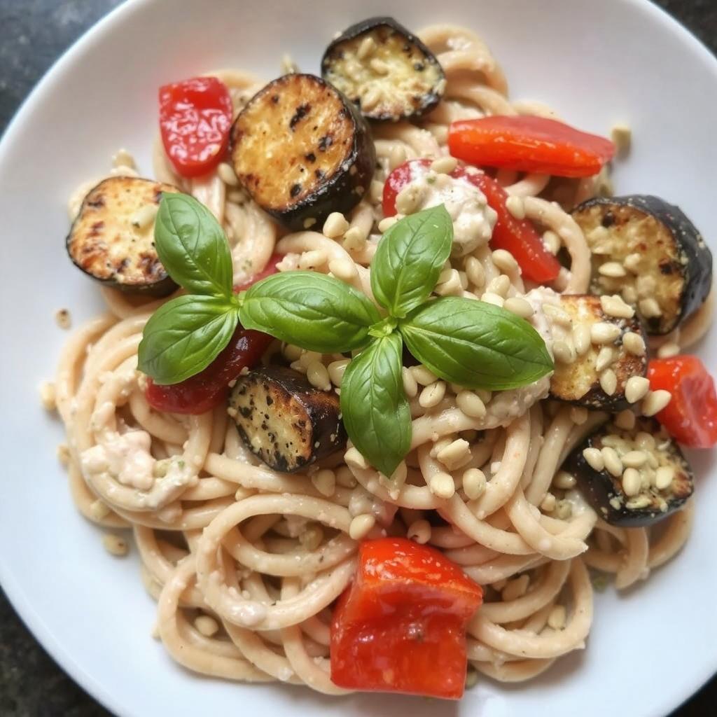 Denne retten er en fest for smaksløkene! Den kremete sausen, laget med plantebasert fløte, binder sammen pastaen og de grillede grønnsakene på en fantastisk måte. Fullkornspastaen gir en rustikk, nøtteaktig tekstur som gjør at retten føles både mettende og tilfredsstillende. De grillede grønnsakene – paprika, aubergine og zucchini – gir en lett røyksmak og en deilig sødme som balanserer den kremete sausen perfekt. Den aromatiske smaken fra timian og oregano gir et ekstra løft og gjør retten til en ekte smaksopplevelse.