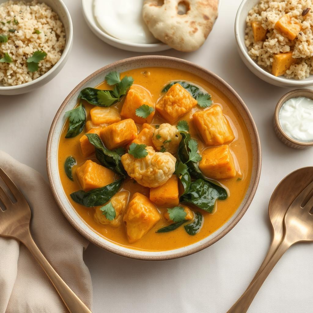 Jeg elsker hvordan denne grønnsakscurryen kombinerer fyldige, varme kryddersmaker med en silkemyk tekstur fra kokosmelken. Søtpotetene tilfører en deilig sødme og blir myke og fløyelsaktige under koking, mens blomkålbitene gir litt tyggemotstand. Spinaten gjør retten frisk og lett samtidig som den smelter pent inn i sausen. Krydder som gurkemeie og garam masala gir retten en dyp, jordnær smak, mens chiliflakene tilfører akkurat passe med varme. Hele retten balanseres av den milde kremetheten fra kokosmelken – det er som en klem i en skål!
