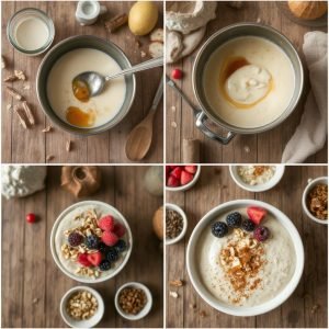 - Ha havremelk og vann i en liten kjele og varm opp til det nesten koker.