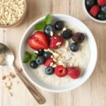 - Server grøten i boller og topp med friske bær, fruktskiver, hakkede nøtter og chiafrø etter smak.