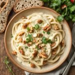 Kremet hvitløks- og urtepasta med ristede nøtter