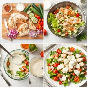 Denne kyllingsalaten er en sann fryd for sansene. Kyllingen er krydret med paprikapulver og hvitløkspulver, noe som gir en lett røkt aroma og en saftig konsistens. Grønnsakene – som agurk, cherrytomater og ruccola – er sprø og friske, noe som gir salaten en perfekt balanse mellom myke og knasende teksturer. Den kremete dressingen, laget med gresk yoghurt, sitronsaft og en liten touch av honning, tilfører en syrlig og lett sødme som harmonerer perfekt med de andre ingrediensene. En håndfull ristede frø på toppen gir en deilig nøtteaktig crunch som gjør hver bit til en opplevelse.