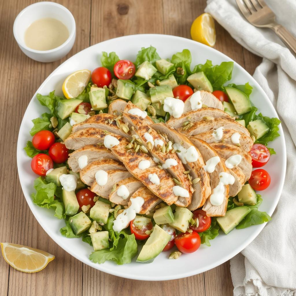 Denne kyllingsalaten er en sann fryd for sansene. Kyllingen er krydret med paprikapulver og hvitløkspulver, noe som gir en lett røkt aroma og en saftig konsistens. Grønnsakene – som agurk, cherrytomater og ruccola – er sprø og friske, noe som gir salaten en perfekt balanse mellom myke og knasende teksturer. Den kremete dressingen, laget med gresk yoghurt, sitronsaft og en liten touch av honning, tilfører en syrlig og lett sødme som harmonerer perfekt med de andre ingrediensene. En håndfull ristede frø på toppen gir en deilig nøtteaktig crunch som gjør hver bit til en opplevelse.