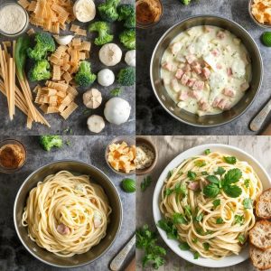 Pasta med kremet saus og skinke er en klassiker som mange har et nært forhold til. Den stammer fra det italienske kjøkkenet, hvor enkle og smakfulle retter med pasta ofte ble laget for å utnytte det som var tilgjengelig i kjøkkenet. Over tid har retten blitt tilpasset og utviklet seg, og i dag er det mange varianter. Jeg har valgt å lage en sunnere versjon ved å bruke fullkornspasta og plantebasert fløte, for å gjøre retten litt lettere uten at den mister den deilige kremete smaken. Denne retten har blitt en favoritt i vårt hus, og jeg elsker hvordan den balanserer de milde smakene med et lett krydderpreg.