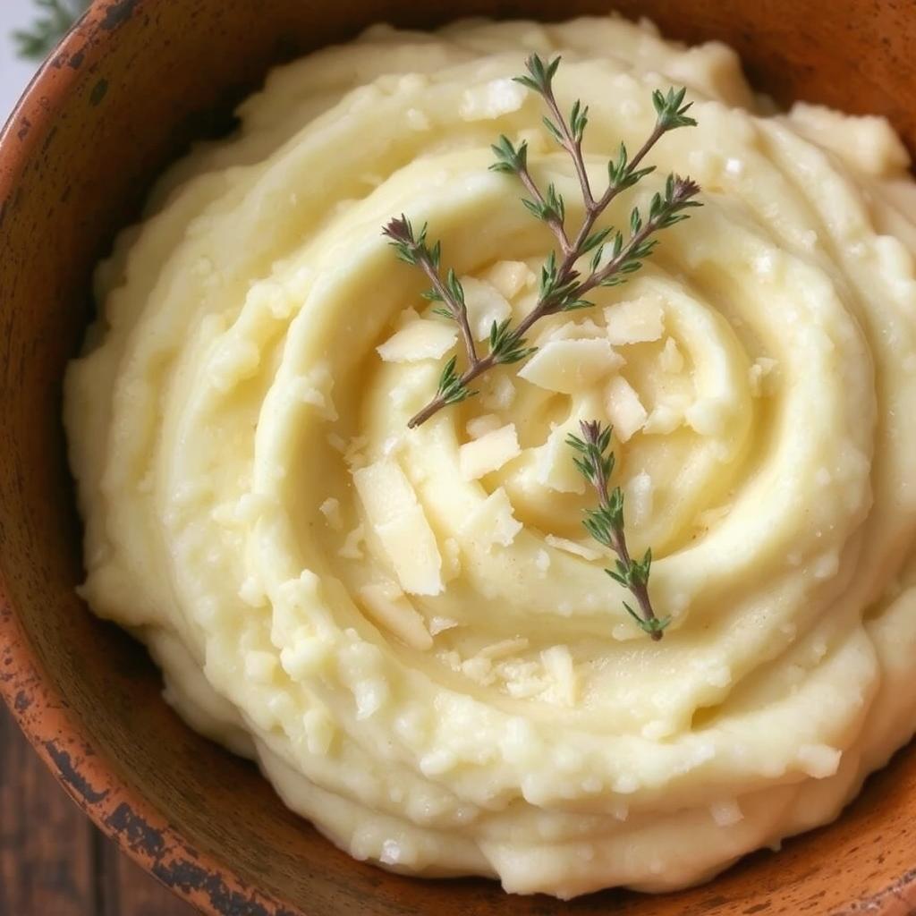 Anrett potetmosen i en skål, topp med ekstra parmesan og friske urter for en dekorativ finish.