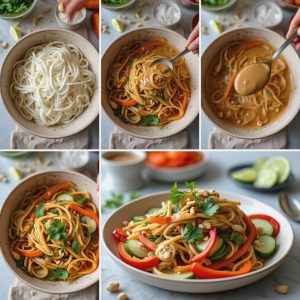 Salaten har en nydelig kontrast av silkemyke nudler, knasende grønnsaker og en fyldig dressing som nesten smelter på tunga. Jeg elsker hvordan peanøttsausen pakker alt inn med en mild sødme, et lite sting av hvitløk og syrligheten fra lime. Det hele føles både friskt og mettet. Det er en rett med lag – du kjenner noe nytt i hver bit: litt chili, litt sprøtt, litt mykt. Jeg liker også at det ikke er behov for varme – perfekt når man ikke orker å slå på komfyren.
