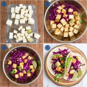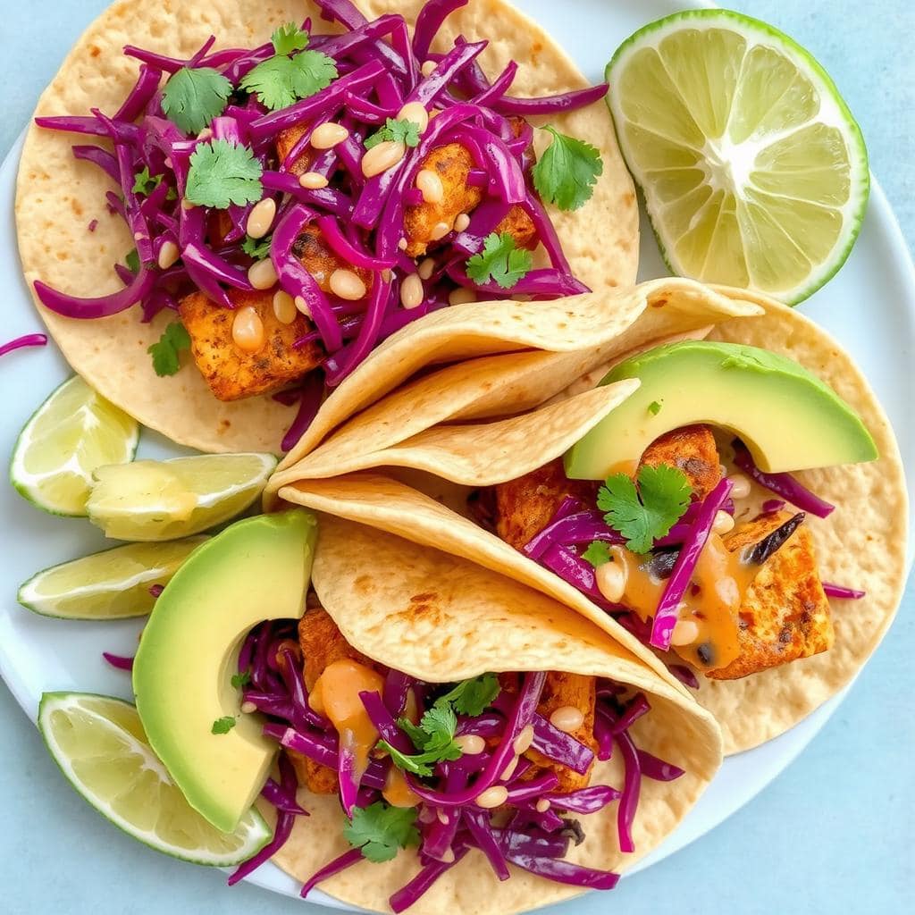 - Fyll hver lefse med en porsjon tofu, rødkålsalat og skivet avocado. Topp med vegansk dressing eller salsa, og server med limebåter.