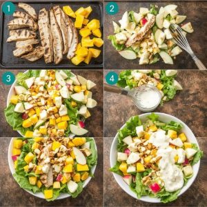 Denne kyllingsalaten med frukt er inspirert av en vennetur til Spania. Der fikk vi ofte servert salater som kombinerte kjøtt og frukt. Jeg ble fascinert av hvordan sødmen fra frukten balanserte det salte fra kyllingen. Hjemme på mitt eget kjøkken tilpasset jeg oppskriften til norske råvarer. Jeg fant en balanse mellom friske grønnsaker, saftig frukt og en kremet sitrusdressing. Nå er salaten blitt en favoritt hos familien. Den passer både som et lett måltid og som en rett til spesielle anledninger.