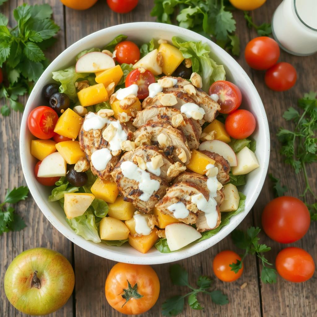 Denne kyllingsalaten med frukt er inspirert av en vennetur til Spania. Der fikk vi ofte servert salater som kombinerte kjøtt og frukt. Jeg ble fascinert av hvordan sødmen fra frukten balanserte det salte fra kyllingen. Hjemme på mitt eget kjøkken tilpasset jeg oppskriften til norske råvarer. Jeg fant en balanse mellom friske grønnsaker, saftig frukt og en kremet sitrusdressing. Nå er salaten blitt en favoritt hos familien. Den passer både som et lett måltid og som en rett til spesielle anledninger.