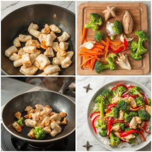 - Forbered ingrediensene: Skjær kyllingfilet i strimler, del brokkolien i buketter, og kutt gulrot og paprika i tynne strimler. Finhakk hvitløk og riv ingefær.