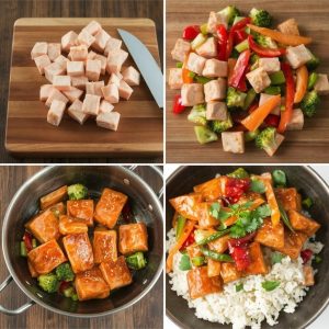 - Server retten rykende varm med ris eller nudler. Dryss over sesamfrø eller fersk koriander som pynt.