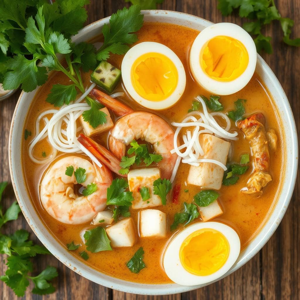 Laksa er en populær nudelsuppe i Sørøst-Asia, spesielt kjent i Malaysia, Singapore og Indonesia. Den kombinerer kinesiske og malaysiske smaker og har mange varianter. De to mest kjente variantene er Curry Laksa, med en kremet kokosmelkbase, og Asam Laksa, med en syrlig tamarindkraft. Laksa er kjent for sin komplekse smak som balanserer krydret, kremet, søtt og syrlig i én bolle. Jeg elsker Laksa for dens intense aroma og hvordan hver slurk gir en varmende eksplosjon av smaker.