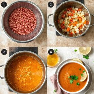 Suppen er varmende og krydret, med en jordnær smak fra linsene og en dyp, aromatisk tone fra spisskummen. Linsene gir suppen en fyldig og kremaktig tekstur når de kokes, mens løk og gulrøtter tilfører sødme. Et hint av sitron på toppen balanserer smaken og gir en frisk avslutning.