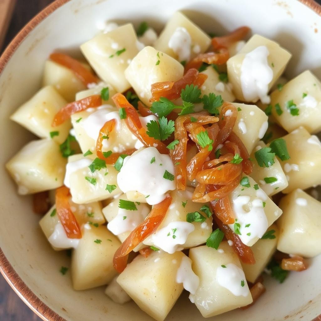 Kort Historie: Potetsalat er en tidløs rett som har vært en del av både fest- og hverdagsmåltider i Norge. Å tilsette løk som er stekt eller karamellisert, gir en dybde til smaken og tilfører salaten en nydelig sødme. Kombinert med rømme skapes en frisk og kremet rett som passer til alt fra grillmat til smørbrød. Jeg elsker hvordan denne oppskriften kombinerer klassiske og aromatiske smaker på en balansert måte.