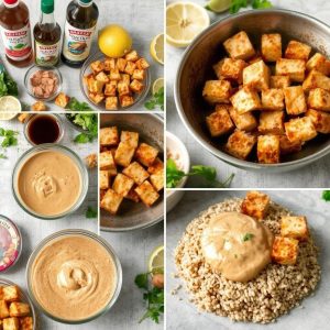 - Forbered tofuen: Skjær tofu i terninger og press ut overflødig væske. Legg tofuen i en bolle og bland med soyasaus, sesamolje, hvitløk, ingefær og limejuice. La det marineres i 10-15 minutter.