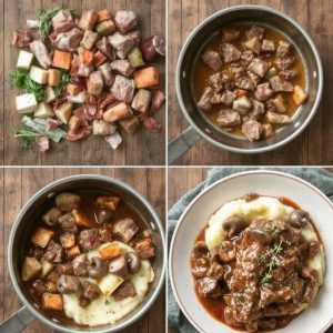 Denne gryten er en perfekt blanding av kraftige smaker og delikate teksturer. Kjøttet er så mørt at det nesten faller fra hverandre, mens rotgrønnsakene har en myk og søt konsistens som gir en fin balanse til sausen. Sausen er rik og silkemyk, med dype smaker fra rødvin og en subtil krydret undertone fra timian og laurbærblad. Når du tar en bit, merker du hvordan alle komponentene smelter sammen til en fyldig og varmende opplevelse. Lukten av hvitløk, urter og rødvin gjør det vanskelig å vente på at gryten skal bli ferdig.