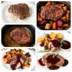 - Server retten: Legg de ovnsbakte grønnsakene på en tallerken, skjær indrefileten i skiver og legg på toppen. Drypp over litt rødvinssaus og server umiddelbart.