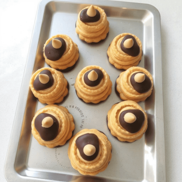 - Smelt den mørke sjokoladen over vannbad. Dypp toppen av hver napoleonshatt i sjokoladen og la dem stivne på et kjølig sted.