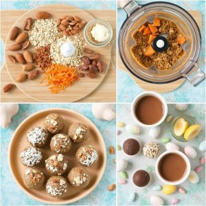 Påsken handler om kos og små overraskelser, og for meg har det alltid vært viktig å lage noe som både smaker godt og er sunt. Disse påskekulene er inspirert av energikuler, som lenge har vært populære som et naturlig alternativ til sjokolade og godteri. Jeg ville skape en variant som passet ekstra godt til påske – fargerik, søt og lett å lage sammen med barna. De er myke, saftige og fulle av gode ingredienser som nøtter, gulrot og dadler. Perfekte i påskeegget, som en liten snack eller på et festlig påskebord.