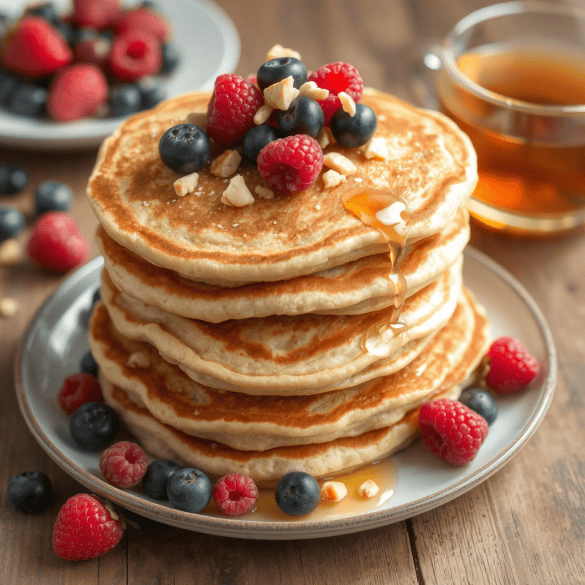 Disse nydelige fullkornspannekakene kombinerer den naturlige sødmen fra moden honning med friskheten fra bær, noe som gjør dem til en utsøkt frokost eller en sunnere dessert. Med en herlig gylden overflate og en luftig, myk tekstur, er disse pannekakene laget med grovmel for en god dose fiber, noe som gir en mer mettende og næringsrik opplevelse.