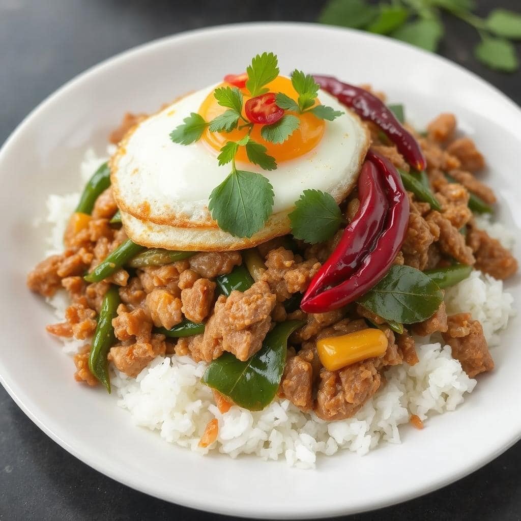 Jeg lager Pad Krapow Moo når jeg vil ha en rask, men smakfull middag med autentisk thailandsk smak. Mitt beste tips er å ikke spare på hvitløk og chili for å få den rette styrken. Bruk fersk hellig basilikum hvis du finner det, men thaibasilikum fungerer også godt som et alternativ. Stek gjerne et egg med en sprø kant (kai dao) for å komplettere retten. En av mine beste minner er å nyte denne retten fra en gatebod i Bangkok, hvor den ble tilberedt på noen få minutter over høy varme.