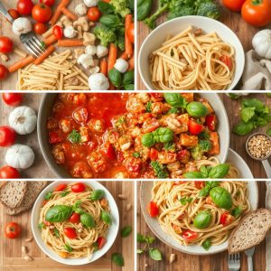 Pasta med tomatsaus og grønnsaker er en av de første rettene jeg laget da jeg begynte å utforske sunnere matlaging. Jeg husker at barna mine elsket det, og vi lagde alltid litt ekstra for å ha til lunsj dagen etter. Et lite tips jeg kan dele, er å bruke friske tomater om mulig, da de gir en ekstra sødme og friskhet til sausen. Jeg bruker alltid fullkornspasta for ekstra fiber og næring – og så liker jeg å toppe retten med ristede pinjekjerner for litt ekstra crunch.