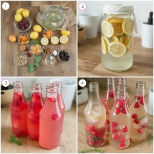 Tilsett bringebær, sitronmelisse og sitronskall i flaskene for andre fermentering.