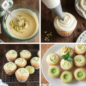 - Montering: Sprøyt eller smør pistasjkremen på de avkjølte cupcakesene og pynt med hakkede pistasjnøtter.