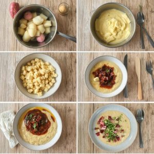- Lag potetmos: Hell av vannet fra potetene og mos dem med en potetmoser eller visp. Tilsett melk, smør, salt og muskat. Rør til mosen er glatt og kremet.