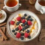 Disse pannekakene er utrolig myke og luftige, med en lett nøtteaktig smak fra havremel. Cottage cheese gir en delikat fyldighet som balanseres perfekt av en liten dash kanel og vanilje. Når de er ferdigstekte, får de en gyllenbrun overflate som gir en lett sprø kontrast til den myke innsiden. Smaken er mild og naturlig, og toppingen av friske bær tilfører en saftig sødme. Hver bit er en nytelse, og duften av pannekakene på stekepannen er rett og slett uimotståelig!