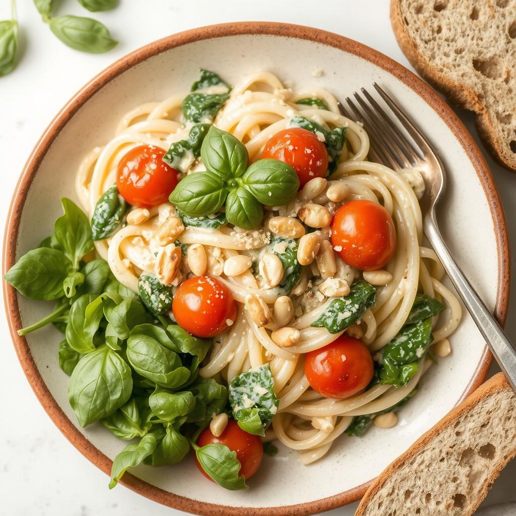 - Servering: Strø over ristede pinjekjerner og basilikum, og server med grønn salat og fullkornsbrød