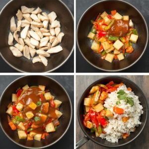 - Stek kyllingen: Varm opp en wok eller stor panne med litt olje. Stek kyllingbitene på høy varme til de er gylne og gjennomstekte. Sett til side.