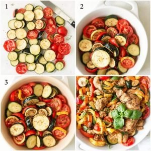 - Plasser grønnsaksskivene oppreist i formen, veksle mellom aubergine, squash, paprika og tomat for et fargerikt mønster.