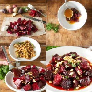 - Lag honningglasuren: Bland honning, balsamicoeddik, olivenolje, salt og pepper i en stor bolle. Vend rødbetene godt i glasuren slik at de dekkes jevnt.