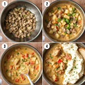 - Ha kjøttet tilbake i gryten, og tilsett kraft, melk og krydder.