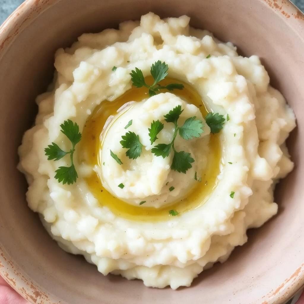 Anrett potetmosen i en serveringsskål, topp med friske urter og drypp litt olivenolje på toppen for ekstra smak.