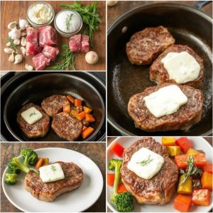 - Varm opp olivenolje og smør i en stor panne på middels høy varme. Stek biffene i ca. 2–3 minutter på hver side, til de får en gyllenbrun skorpe. Ta dem av varmen og legg dem på en bakeplate.