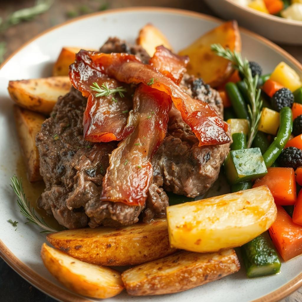 Jeg elsker å lage denne retten på dager hvor jeg ønsker noe enkelt, men samtidig smakfullt. Det minner meg om søndagsmiddager med familien, hvor alle sitter lenge rundt bordet og koser seg. Mitt beste tips er å steke baconet først, slik at du kan bruke baconfettet til å steke biffen for ekstra smak. Hvis du vil ha en sunnere variant, anbefaler jeg å bruke magert bacon og servere retten med søtpoteter eller blomkålmos i stedet for vanlige poteter. Og husk – et dryss med ferske urter på toppen kan løfte retten til et helt nytt nivå!
