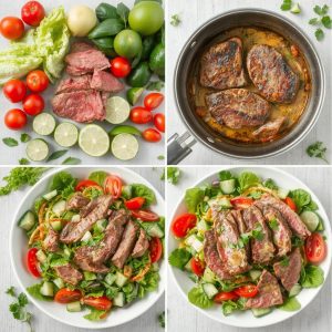 Jeg elsker denne biffsalaten fordi den gir en utrolig balanse mellom smaker og teksturer. Den møre biffen, som er marinert i en blanding av soyasaus, lime og ingefær, har en rik, salt og syrlig smak som løfter retten. Grønnsakene, som sprø salatblader, søte cherrytomater og knasende agurk, gir en deilig kontrast til det saftige kjøttet. Dressingen av lime og sesamolje binder alt sammen og tilfører en silkemyk syrlighet som smelter sammen med resten av rettens smaker. Det er en salat som både føles lett og luksuriøs, perfekt til både hverdagsmiddager og festlige anledninger.