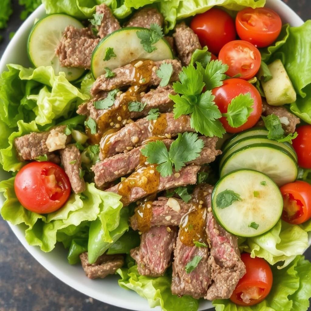 Jeg elsker denne biffsalaten fordi den gir en utrolig balanse mellom smaker og teksturer. Den møre biffen, som er marinert i en blanding av soyasaus, lime og ingefær, har en rik, salt og syrlig smak som løfter retten. Grønnsakene, som sprø salatblader, søte cherrytomater og knasende agurk, gir en deilig kontrast til det saftige kjøttet. Dressingen av lime og sesamolje binder alt sammen og tilfører en silkemyk syrlighet som smelter sammen med resten av rettens smaker. Det er en salat som både føles lett og luksuriøs, perfekt til både hverdagsmiddager og festlige anledninger.