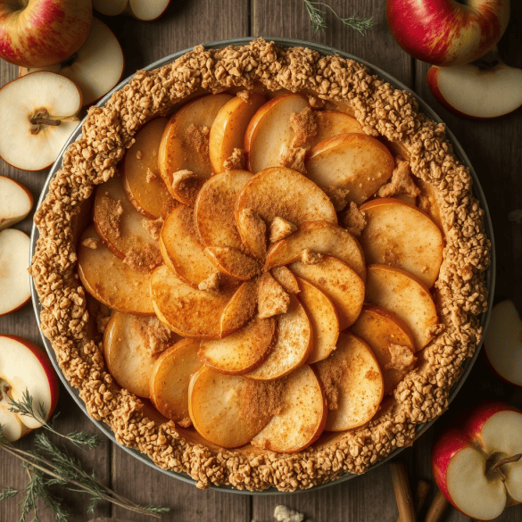Bunnen, laget med havremel og hakkede mandler, gir en lett nøtteaktig smak og en behagelig knas som kontrast til de saftige eplene. Den er både sprø og næringsrik, og et sunnere alternativ til vanlig paibunn, uten å ofre smak eller tekstur. Når du tar en bit, får du følelsen av å være innpakket i en behagelig varme, perfekt på kjølige dager eller når du ønsker noe ekstra godt.