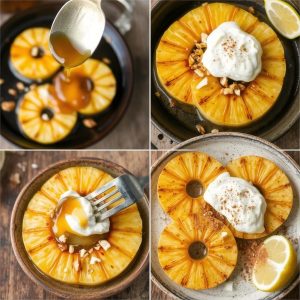 Jeg ville lage en sunnere versjon av karamellisert ananas, og ved å bruke honning i stedet for raffinert sukker fikk jeg den samme deilige karamelliseringen, men på en mer naturlig måte. En klype kanel og et lite dryss havsalt gir dybde, mens ristede nøtter tilfører en deilig sprø kontrast.
